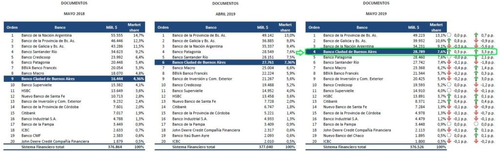 De acuerdo al ranking de entidades financieras elaborado por el Banco Central, a mayo de 2019, el Banco Ciudad fue la entidad que más incrementó su cartera de préstamos comerciales, escalando al 4to. puesto en el sistema financiero argentino para el descuento de documentos, con financiaciones por un total de casi $ 29.000 millones.