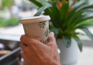 Vasos biodegradables, cajas de cartón para llevar pastelería con un diseño de botánica antigua, que da pena tirarlas. La onda reciclable y sustentable se respira en el aire.