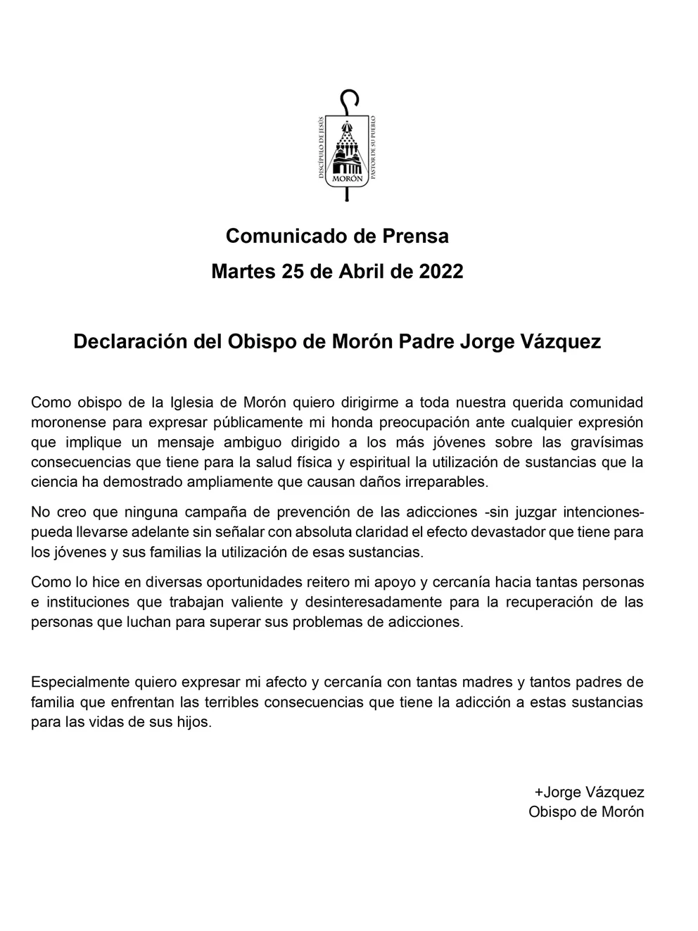 En un comunicado dirigido “a toda la querida comunidad moronense”, el prelado expresó públicamente su “honda preocupación ante cualquier expresión que implique un mensaje ambiguo dirigido a los más jóvenes sobre las gravísimas consecuencias que tiene para la salud física y espiritual la utilización de sustancias que la ciencia ha demostrado ampliamente que causan daños irreparables”.